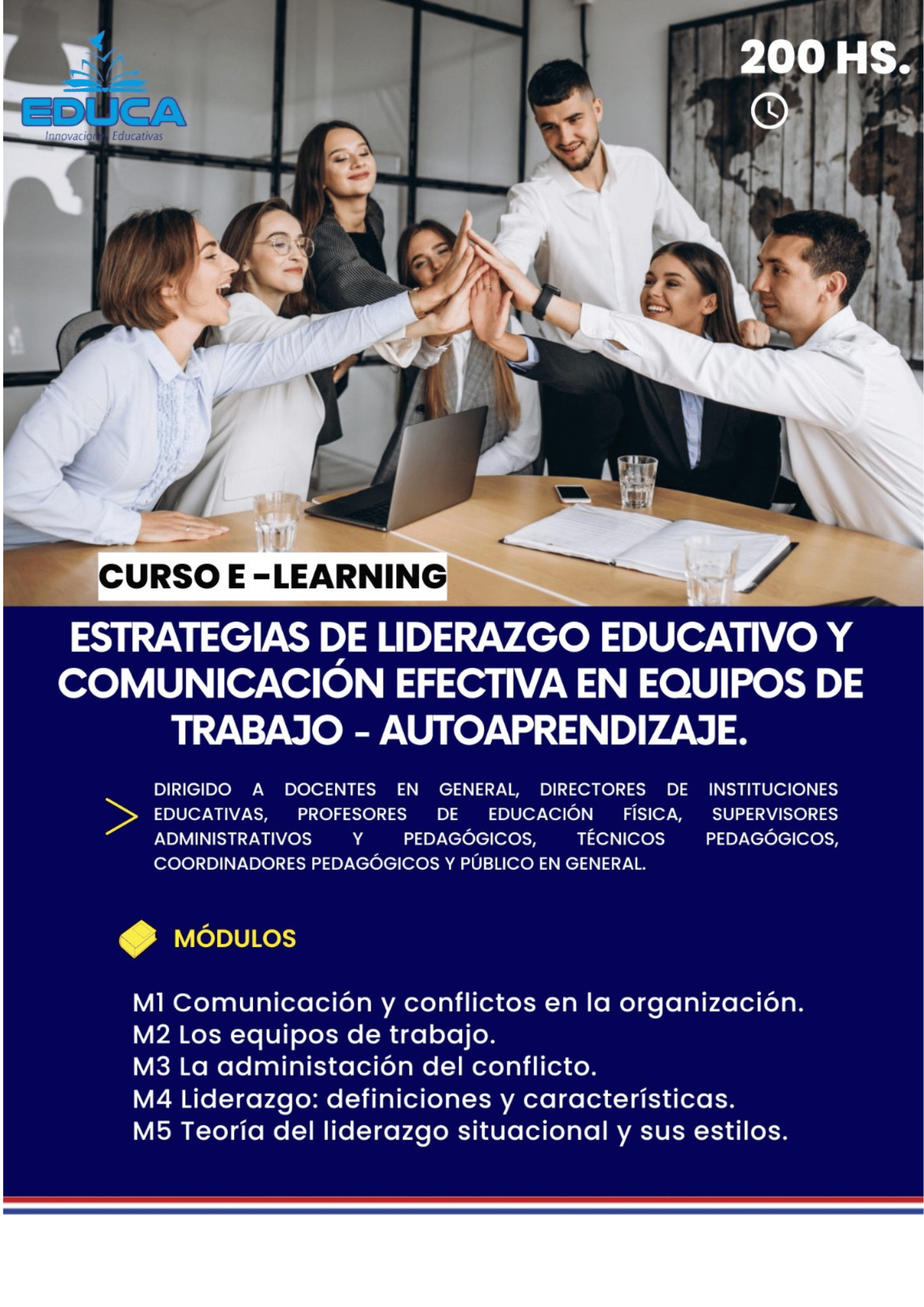 El curso Estrategias de Liderazgo Educativo y Comunicación Efectiva en Equipos de Trabajo está orientado a desarrollar competencias de liderazgo y comunicación en docentes, directivos y profesionales educativos interesados en mejorar el trabajo colaborativo dentro de sus instituciones. Brinda estrategias para gestionar equipos, resolver conflictos, fortalecer la comunicación interna y aplicar modelos de liderazgo situacional que favorezcan un clima organizacional positivo y productivo. Es una propuesta práctica y adaptable a diversos contextos educativos.