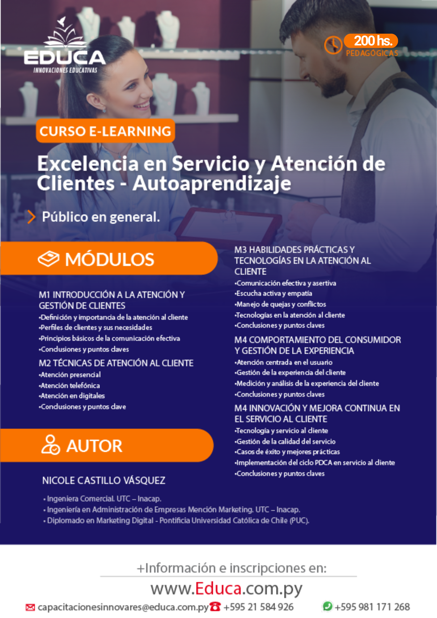 Este curso brinda las herramientas fundamentales para ofrecer una atención al cliente de alto nivel, fortaleciendo habilidades comunicacionales, resolución de conflictos y manejo de situaciones difíciles. El participante aprenderá a crear experiencias positivas, mejorar la satisfacción del cliente y aplicar buenas prácticas de servicio en cualquier entorno. Una capacitación ideal para equipos comerciales, administrativos y todo profesional orientado a la calidad del servicio.