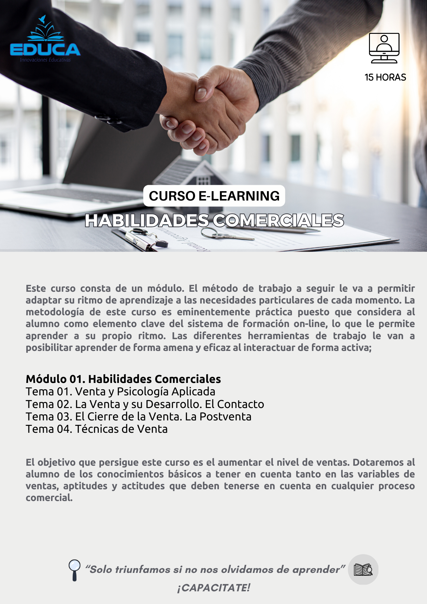 Este curso brinda una formación integral para desarrollar competencias clave en el área comercial, desde la identificación de oportunidades hasta el cierre efectivo de ventas. Los participantes aprenderán técnicas de prospección, comunicación persuasiva, negociación, manejo de objeciones y construcción de relaciones sólidas con los clientes.