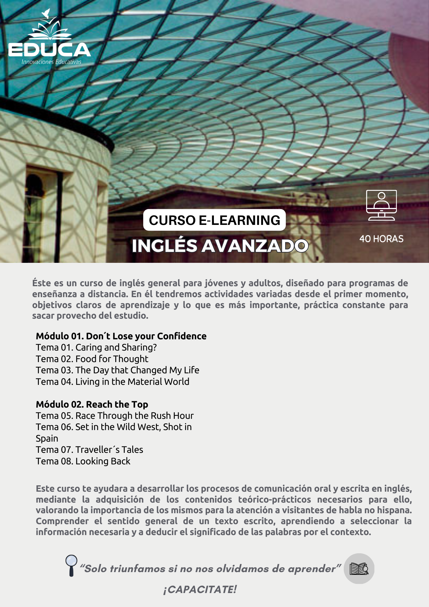Este curso está diseñado para fortalecer las competencias lingüísticas en inglés, enfocándose en la comprensión y producción oral y escrita a un nivel avanzado. Los participantes mejorarán su vocabulario, gramática, pronunciación y habilidades de comunicación en contextos académicos, profesionales y cotidianos.
