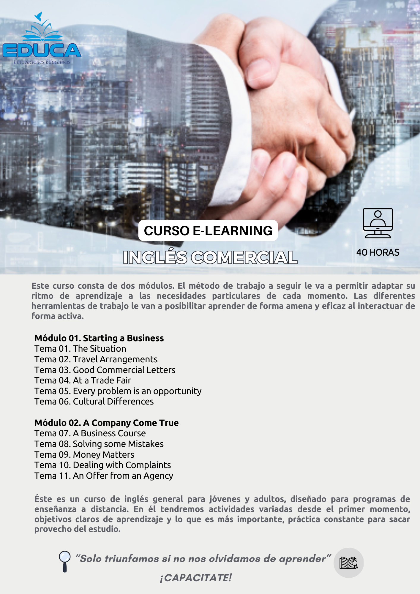 Este curso está diseñado para desarrollar habilidades de comunicación en inglés aplicadas al ámbito empresarial y comercial. Los participantes aprenderán vocabulario especializado, estructuras y expresiones para interactuar con clientes, proveedores y colegas, así como para redactar correos, informes y presentaciones comerciales de manera clara y profesional.