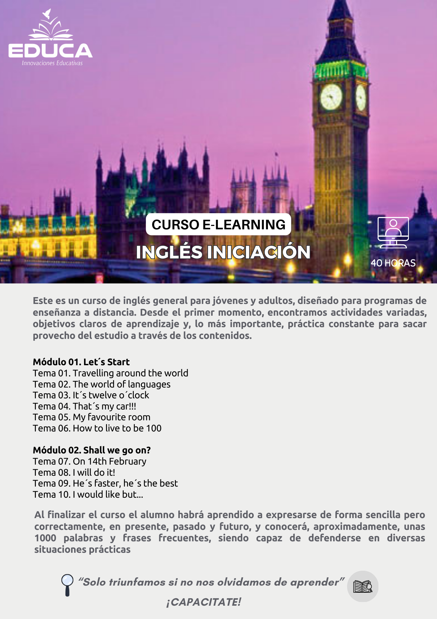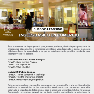 El programa también aborda la comprensión auditiva, la pronunciación y la lectura de textos sencillos, fomentando la confianza y autonomía del estudiante en el aprendizaje del inglés. Ideal para principiantes, estudiantes, profesionales y cualquier persona interesada en iniciar su formación en el idioma.