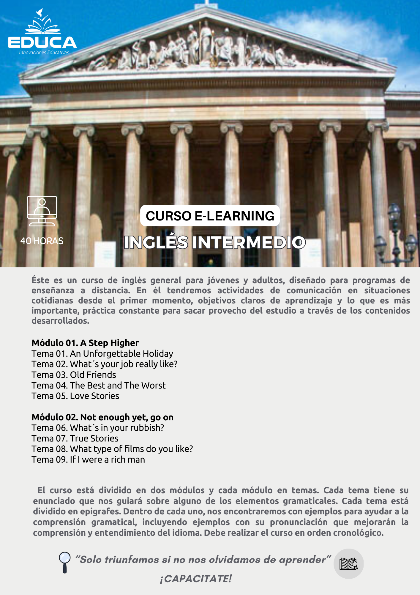 Este curso está orientado a quienes ya poseen conocimientos básicos de inglés y desean consolidar y ampliar sus habilidades comunicativas. Los participantes fortalecerán la gramática, el vocabulario, la comprensión lectora y auditiva, así como la expresión oral y escrita en contextos cotidianos y profesionales.