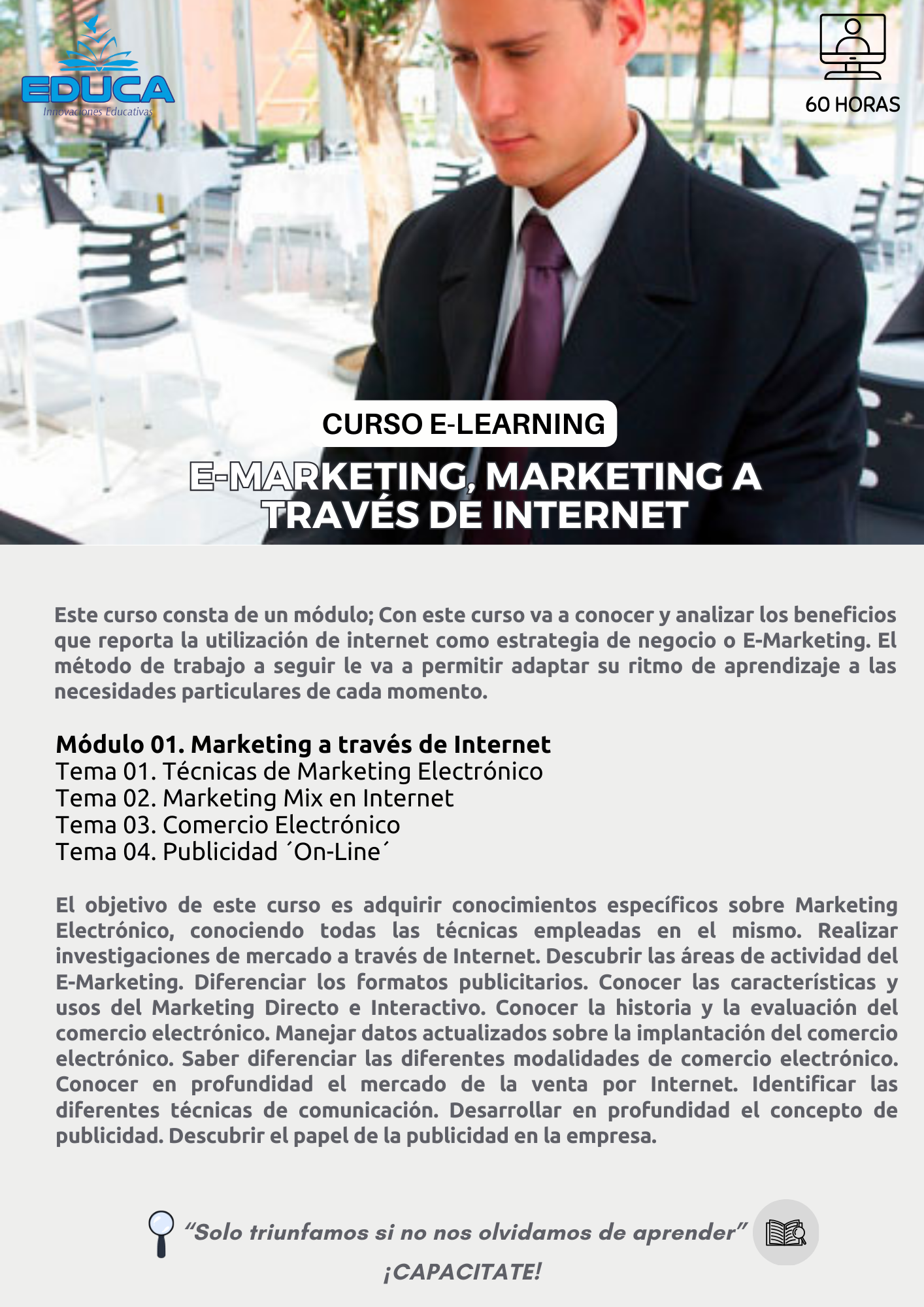 Este curso introduce las principales estrategias y herramientas del marketing digital para promocionar productos y servicios en el entorno online. Los participantes aprenderán a utilizar redes sociales, publicidad digital, email marketing, posicionamiento en buscadores y creación de contenidos para atraer, convertir y fidelizar clientes.