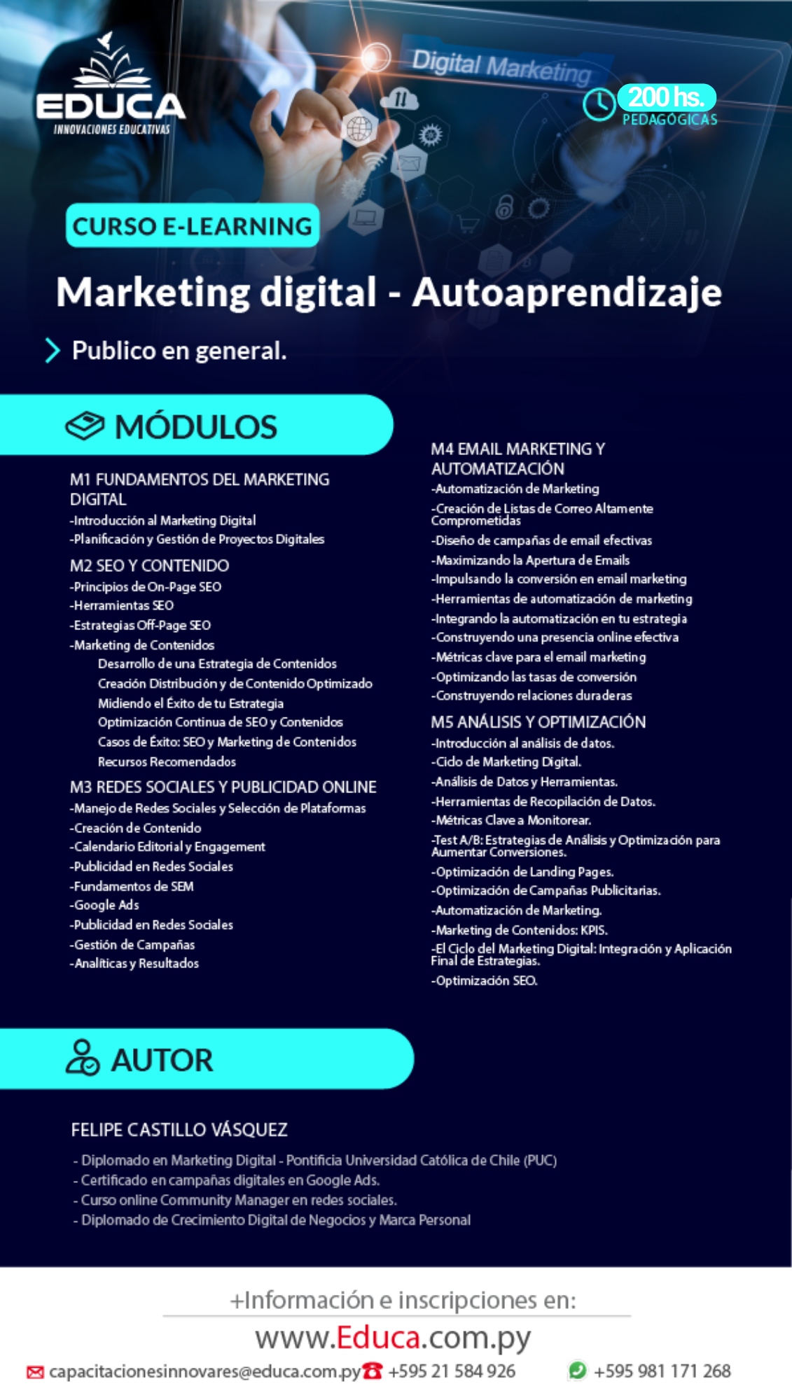 El curso Marketing Digital ofrece una formación completa sobre las estrategias esenciales del marketing digital moderno. El participante aprenderá a gestionar redes sociales, crear contenidos efectivos, utilizar herramientas de análisis, optimizar campañas y comprender el comportamiento del público en entornos digitales. Una capacitación ideal para emprendedores, profesionales y organizaciones que buscan fortalecer su presencia online y mejorar sus resultados en plataformas digitales.