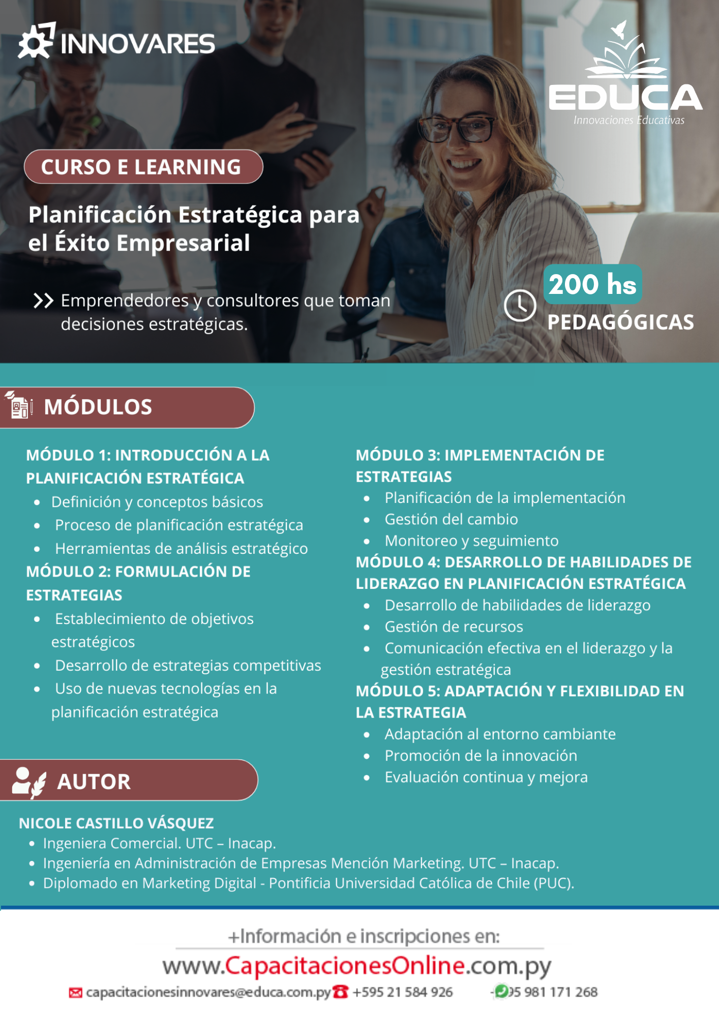 El curso Planificación Estratégica para el Éxito Empresarial ofrece una formación integral para emprendedores, líderes y consultores que buscan tomar decisiones estratégicas acertadas. A través de cinco módulos, el participante aprenderá a analizar su entorno, formular estrategias, liderar procesos de implementación y adaptarse de manera flexible a los cambios del mercado. Una capacitación pensada para fortalecer la visión estratégica y potenciar la gestión organizacional.