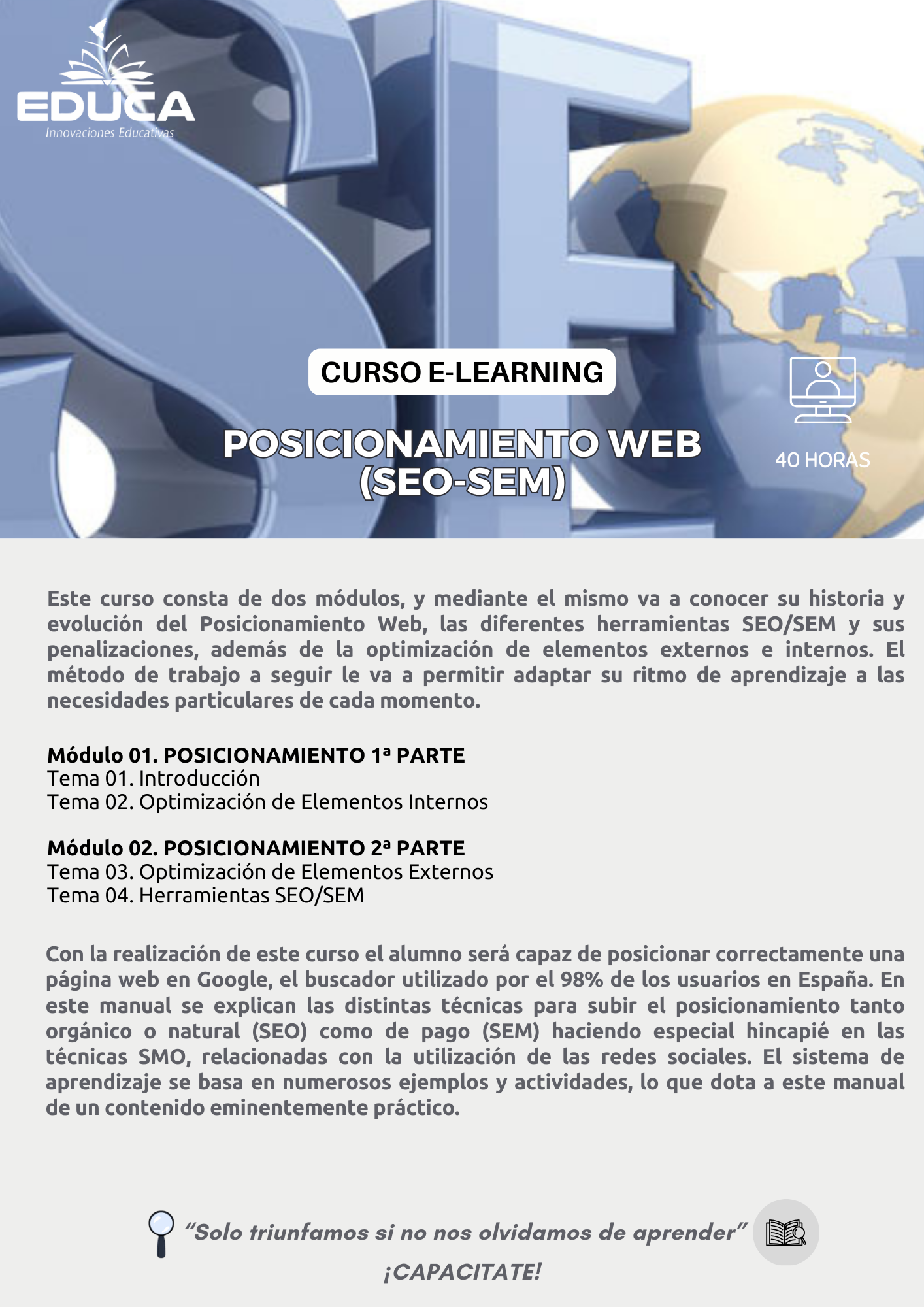 Este curso ofrece una introducción completa a las estrategias y técnicas de SEO (Search Engine Optimization) para mejorar la visibilidad de sitios web en los principales buscadores. Los participantes aprenderán a optimizar contenidos, utilizar palabras clave, mejorar la estructura del sitio, trabajar el SEO técnico y aplicar buenas prácticas que incrementan el tráfico orgánico de manera sostenible.