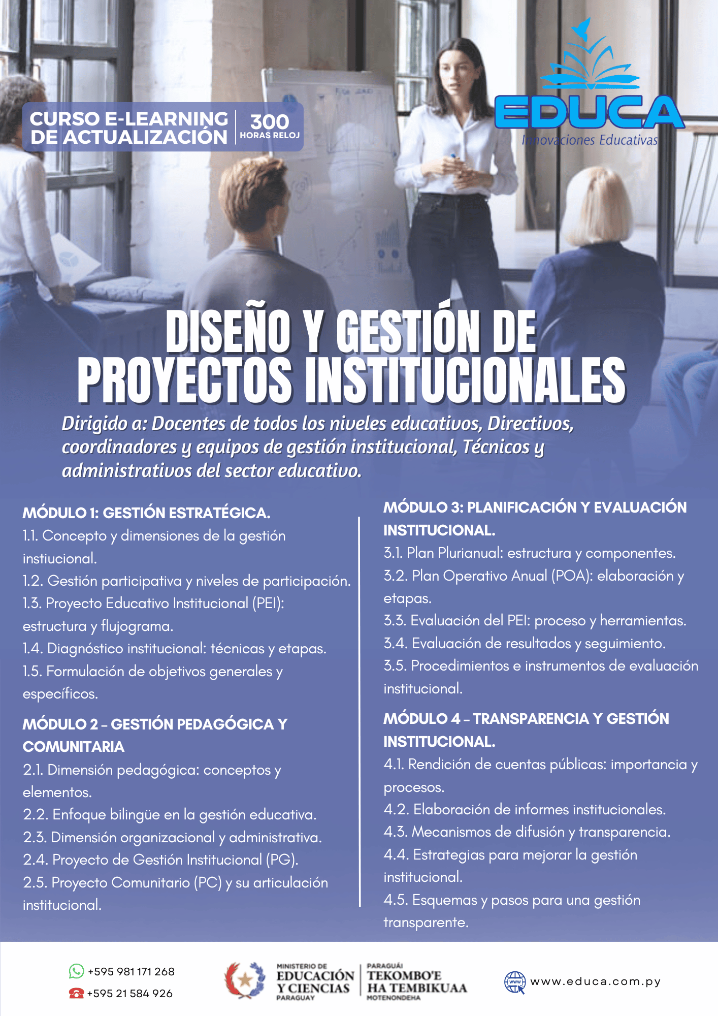 Diseño y Gestión de Proyectos Institucionales es un curso e-learning que brinda herramientas prácticas para planificar, desarrollar y evaluar proyectos dentro de organizaciones educativas o institucionales. Aprenderás a transformar ideas en propuestas concretas, optimizar recursos y gestionar procesos de manera eficiente, fortaleciendo la toma de decisiones y el logro de objetivos estratégicos.