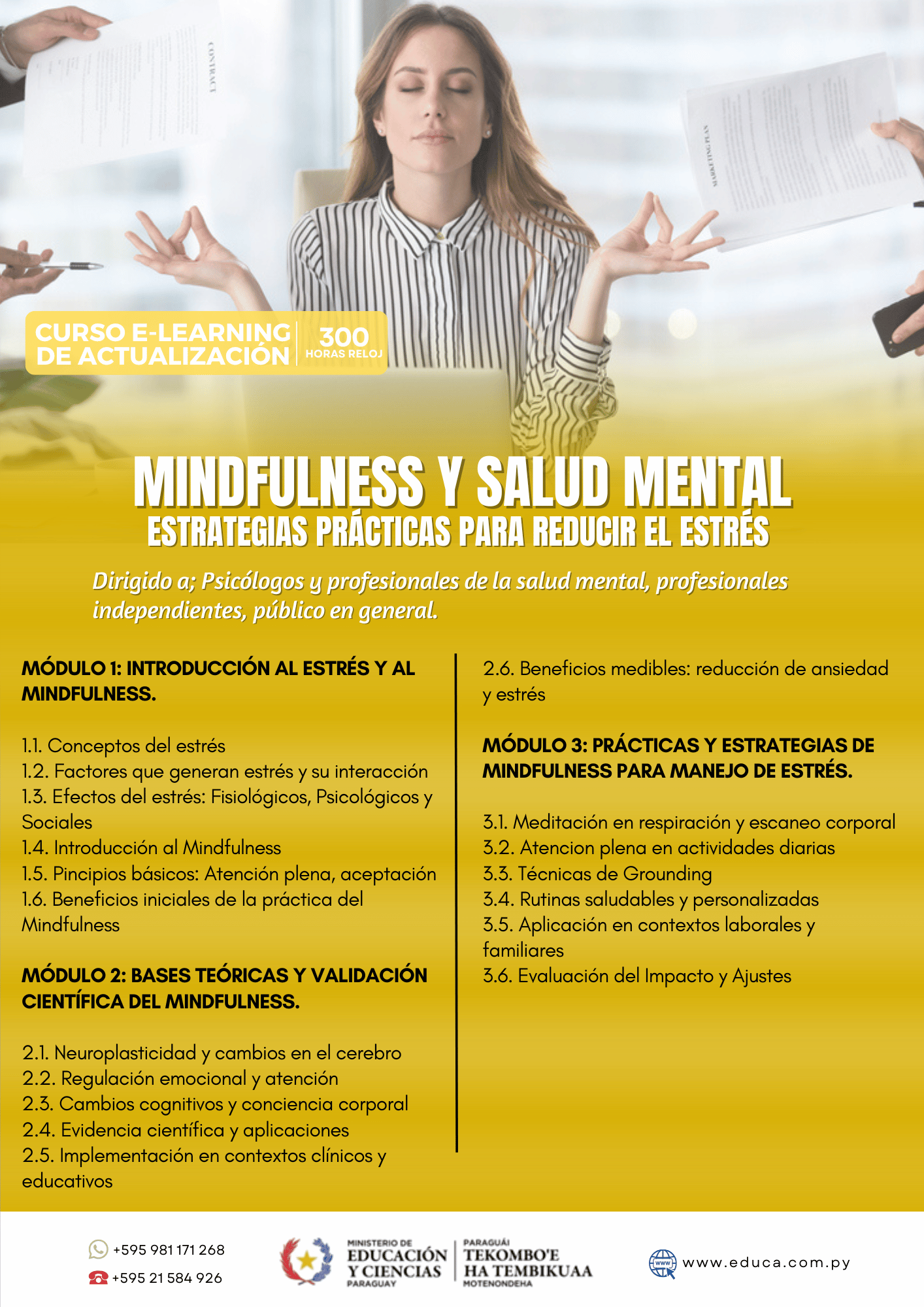 Dirigido a: Docentes, profesionales de la salud, psicólogos, orientadores, estudiantes y toda persona interesada en mejorar su bienestar emocional, gestionar el estrés y promover una mejor calidad de vida.