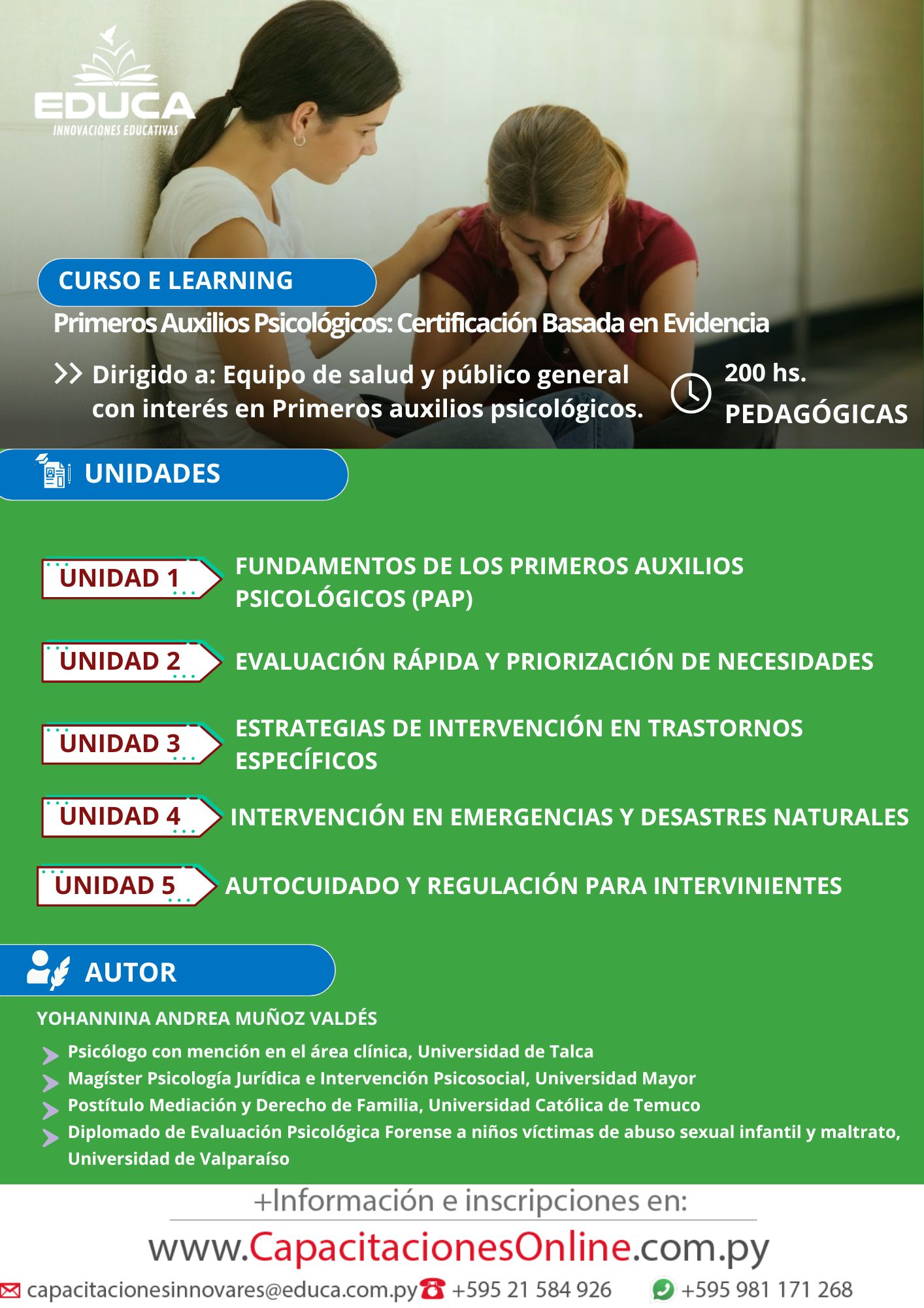 El Curso E-Learning Primeros Auxilios Psicológicos está diseñado para fortalecer las competencias necesarias para proporcionar apoyo emocional y práctico inmediato a personas que han vivido un evento estresante o traumático. Este programa de 200 horas pedagógicas capacita a los participantes en los fundamentos y la aplicación de los Primeros Auxilios Psicológicos (PAP).
